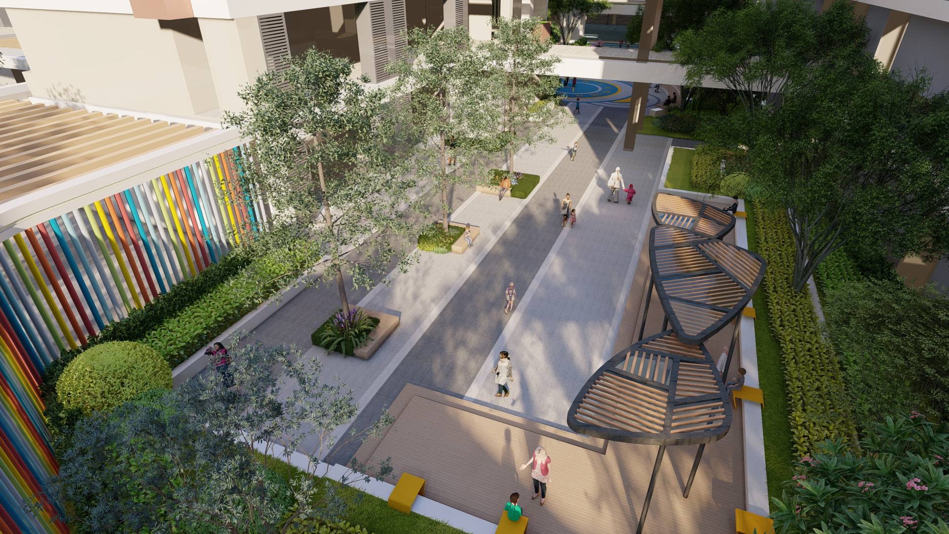 多彩的連廊模糊了校園內(nèi)外的界限,雖身處校園,亦能將夢(mèng)想放飛;綠蔭之間,端坐在樹(shù)池下和木平臺(tái)邊暢讀的孩子們,為他們編織探險(xiǎn)家的夢(mèng)想,提供課間休息、林下閱讀的空間。